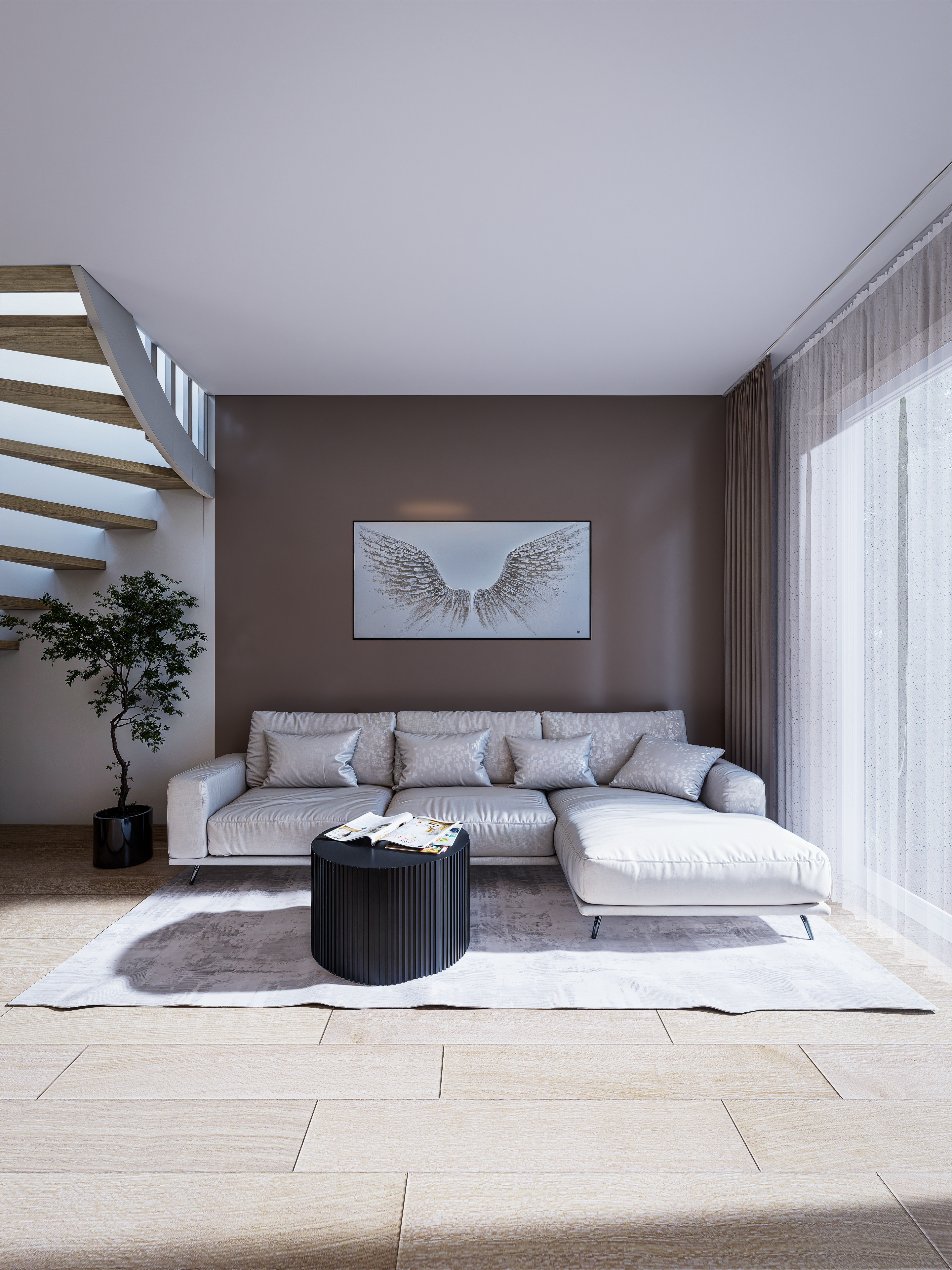 Projekt Väike-Rae on elegantse ja funktsionaalse kodu näide, kus valgusküllane elutuba loob rahuliku ja kutsuva atmosfääri. Pehmed beežid toonid, õhulised kardinad ja hoolikalt valitud mööbel annavad ruumile sooja ja harmoonilise ilme. Seinamaaling lisab interjöörile sügavust ja iseloomu.