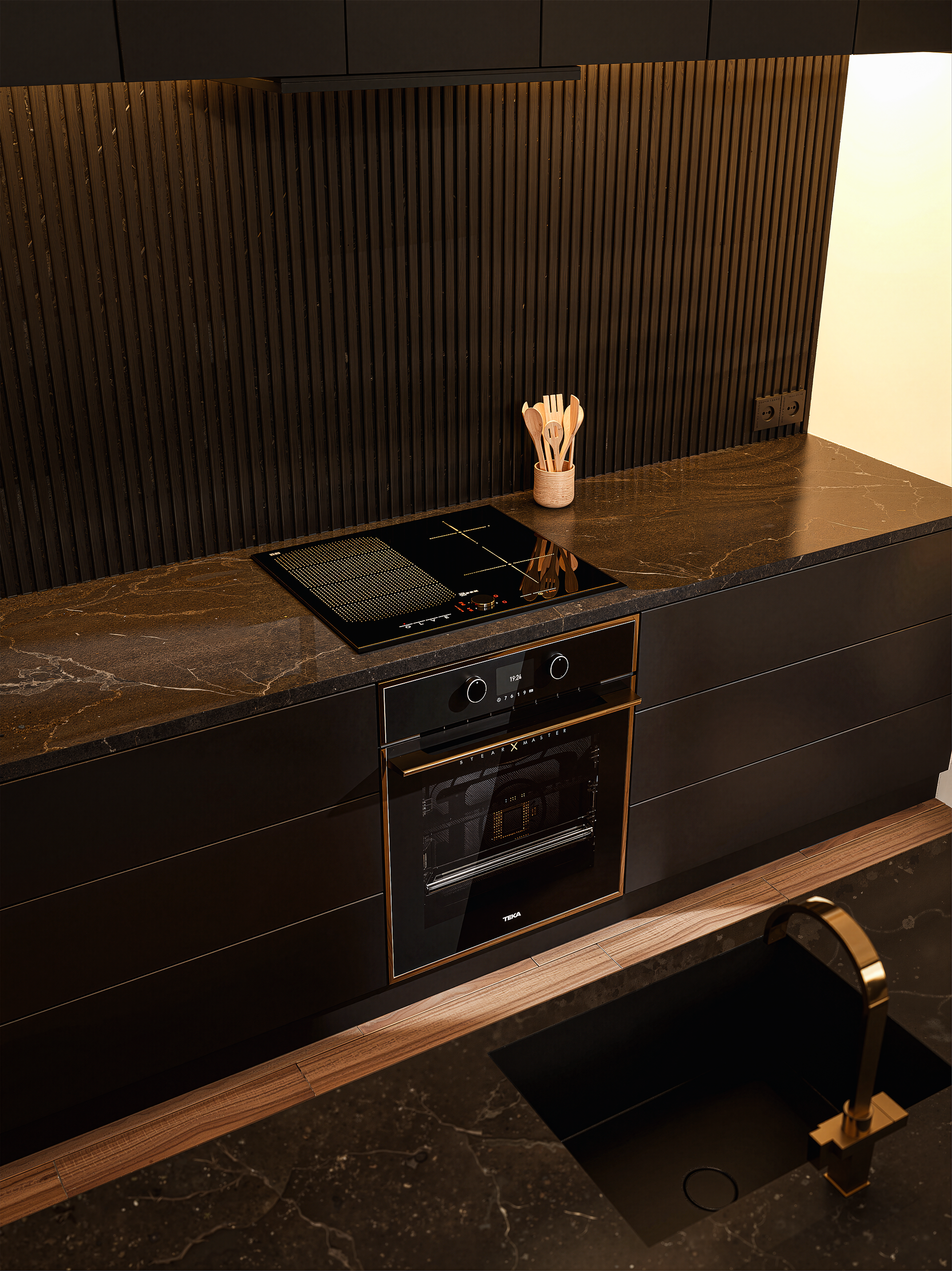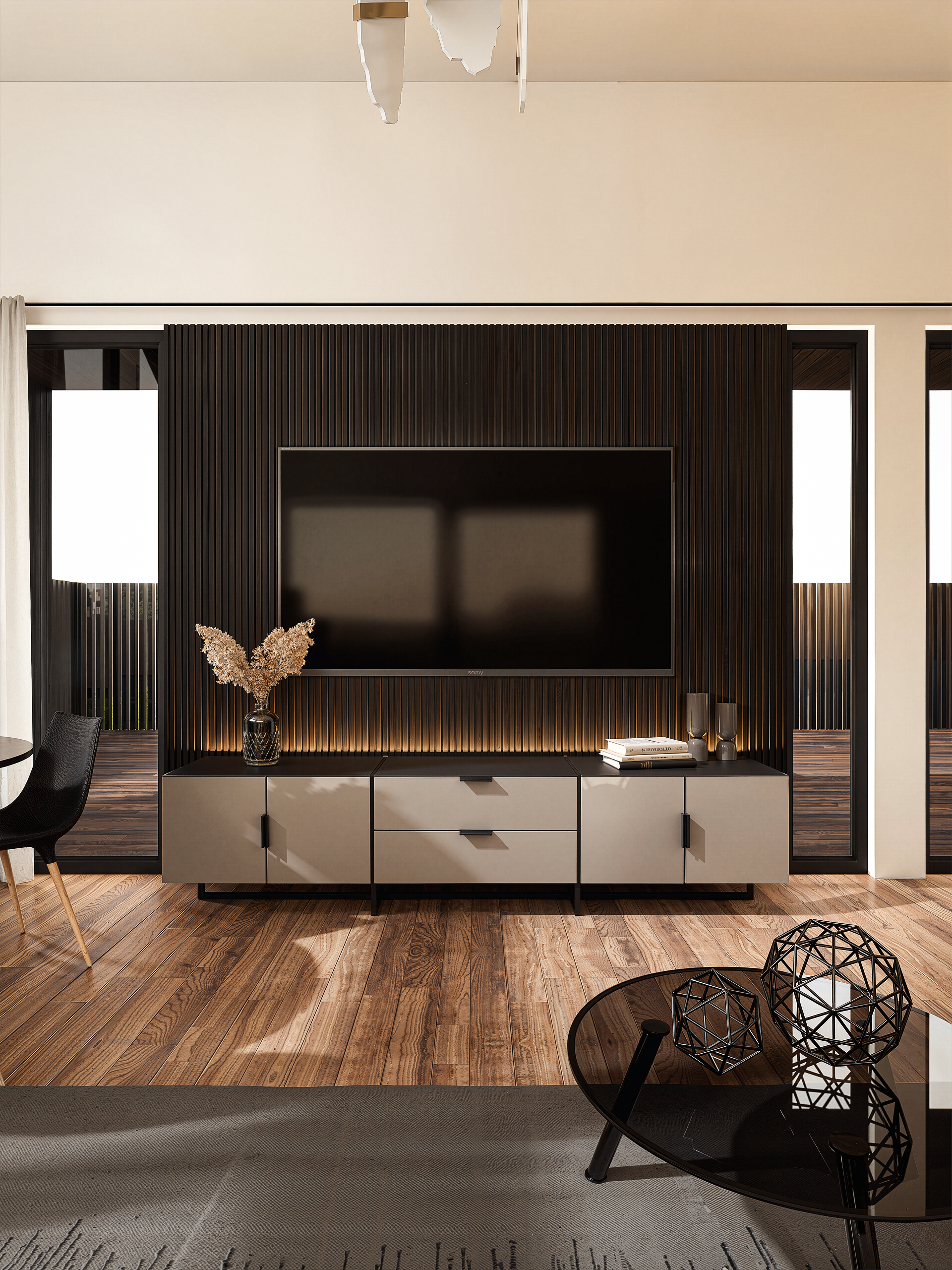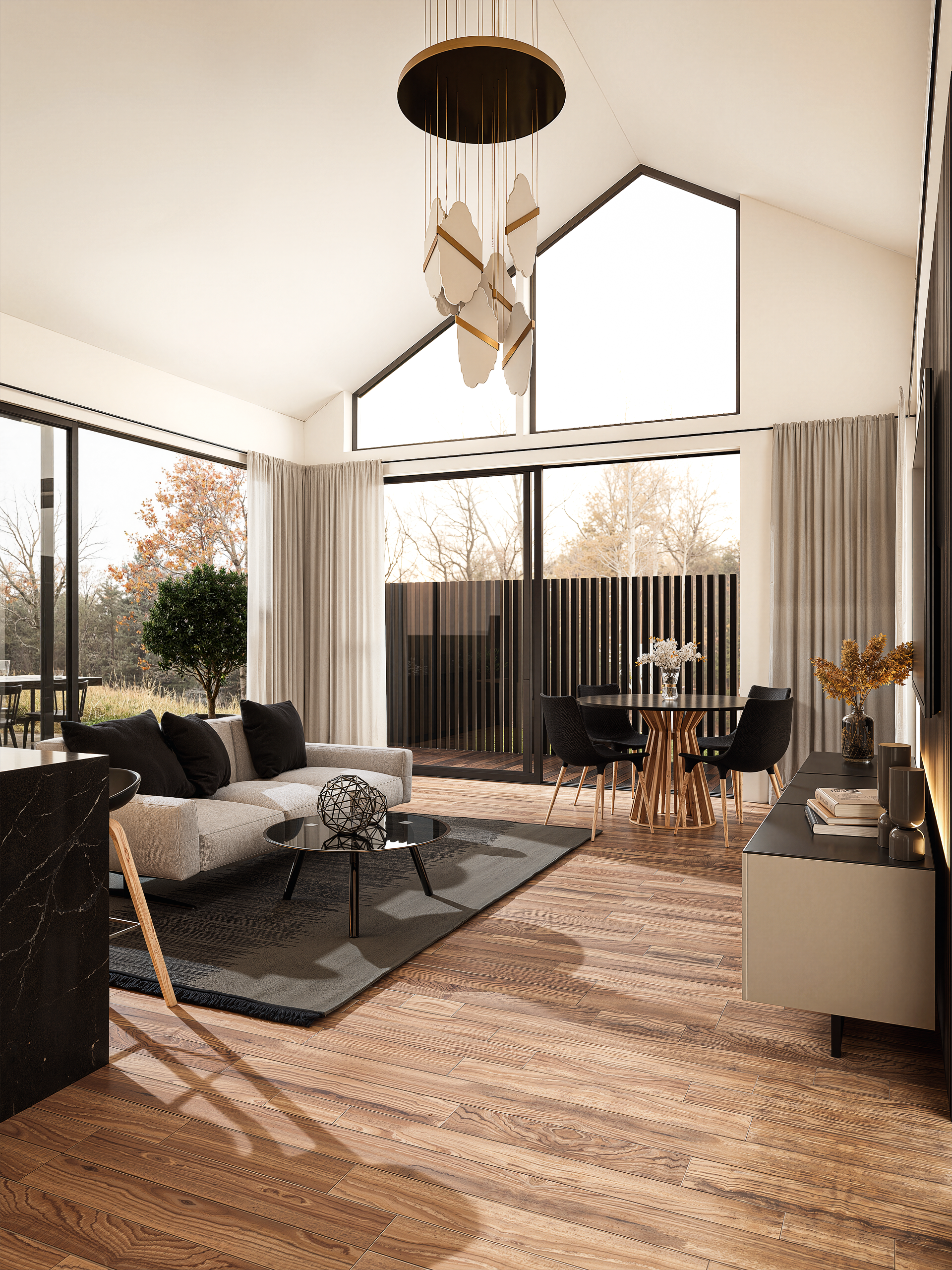 Kaasaegne ja elegantne avatud eluruum, kus tumedad aktsendid kohtuvad soojade looduslike materjalidega. Rikkalik puitpõrand, sügava tooniga köögikapid ja pehmed tekstiilid loovad esindusliku, kuid samas hubase atmosfääri. Põrandast laeni aknad toovad ruumi rohkelt loomulikku valgust ning loovad sujuva ühenduse sise- ja välisruumi vahel. Läbimõeldud valgustus rõhutab arhitektuurseid detaile ning lisab ruumile sügavust ja soojust.