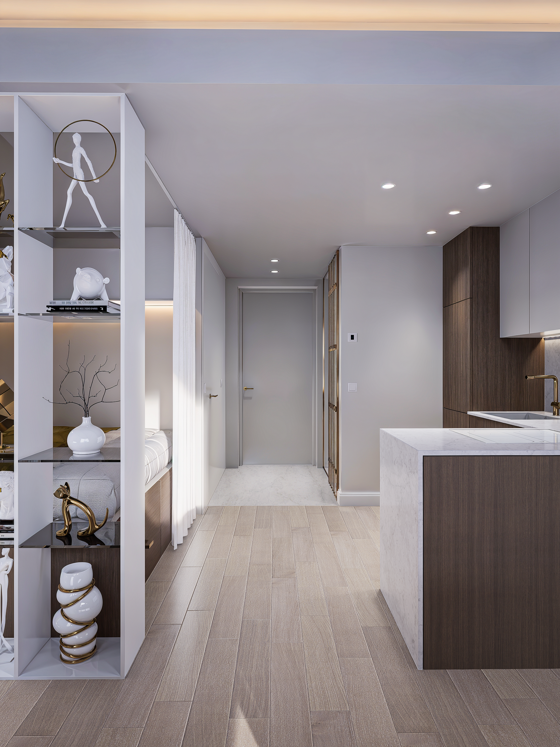 See stiilne ja funktsionaalne korter on suurepärane näide nutikast ruumikasutusest, sisekujundusest ja modernsest disainist. Helged värvitoonid, naturaalsed materjalid ja läbimõeldud detailid loovad harmoonilise õhkkonna, mis on samaaegselt nii praktiline kui ka elegantne. Rohelised aktsendid annavad interjöörile värskuse ja loodusläheduse, samal ajal kui suured aknad toovad tuppa külluslikult loomulikku valgust.