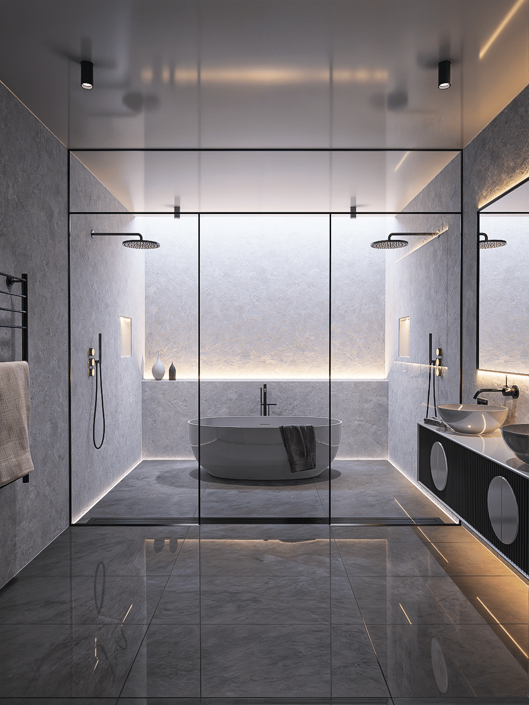 Vannitoa keskpunktiks on suur vann, mis pakub lõõgastust pärast pikka päeva. Stiilsed valamud ja segistid annavad ruumile kaasaegse elegantsi ning piisavalt ruumi kahele kasutajale. Ruumikas avatud dušinurk koos klaasseintega loob vannitoas avaruse ja läbipaistvuse tunde, andes sellele modernse ja õhulise ilme.