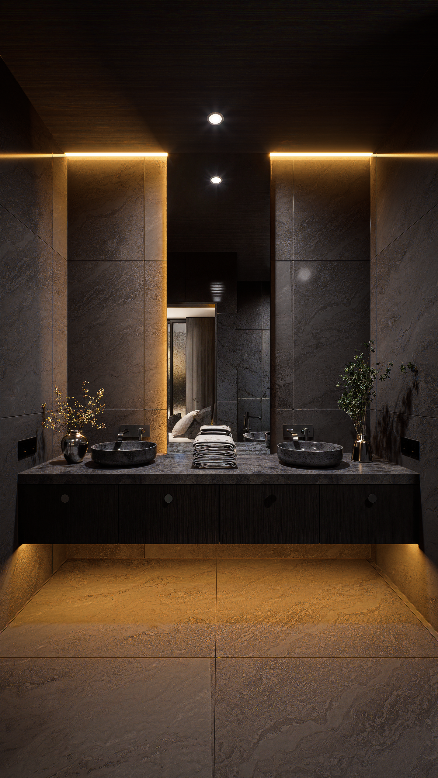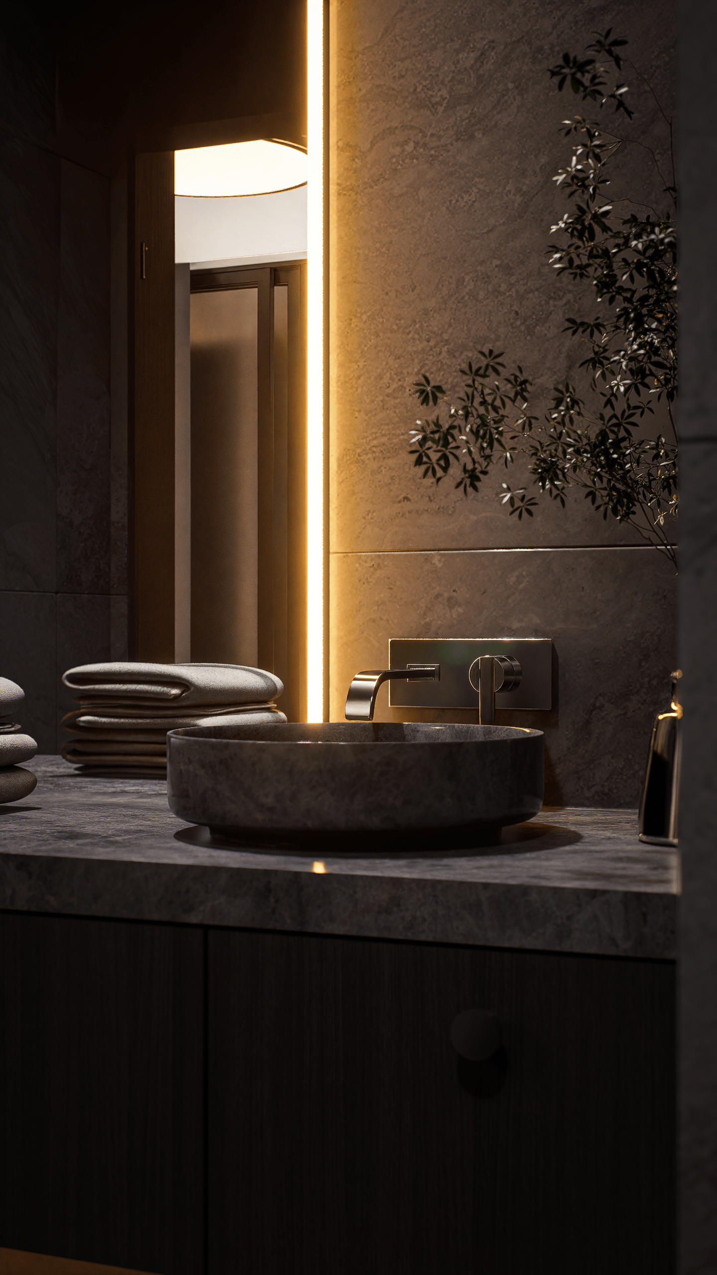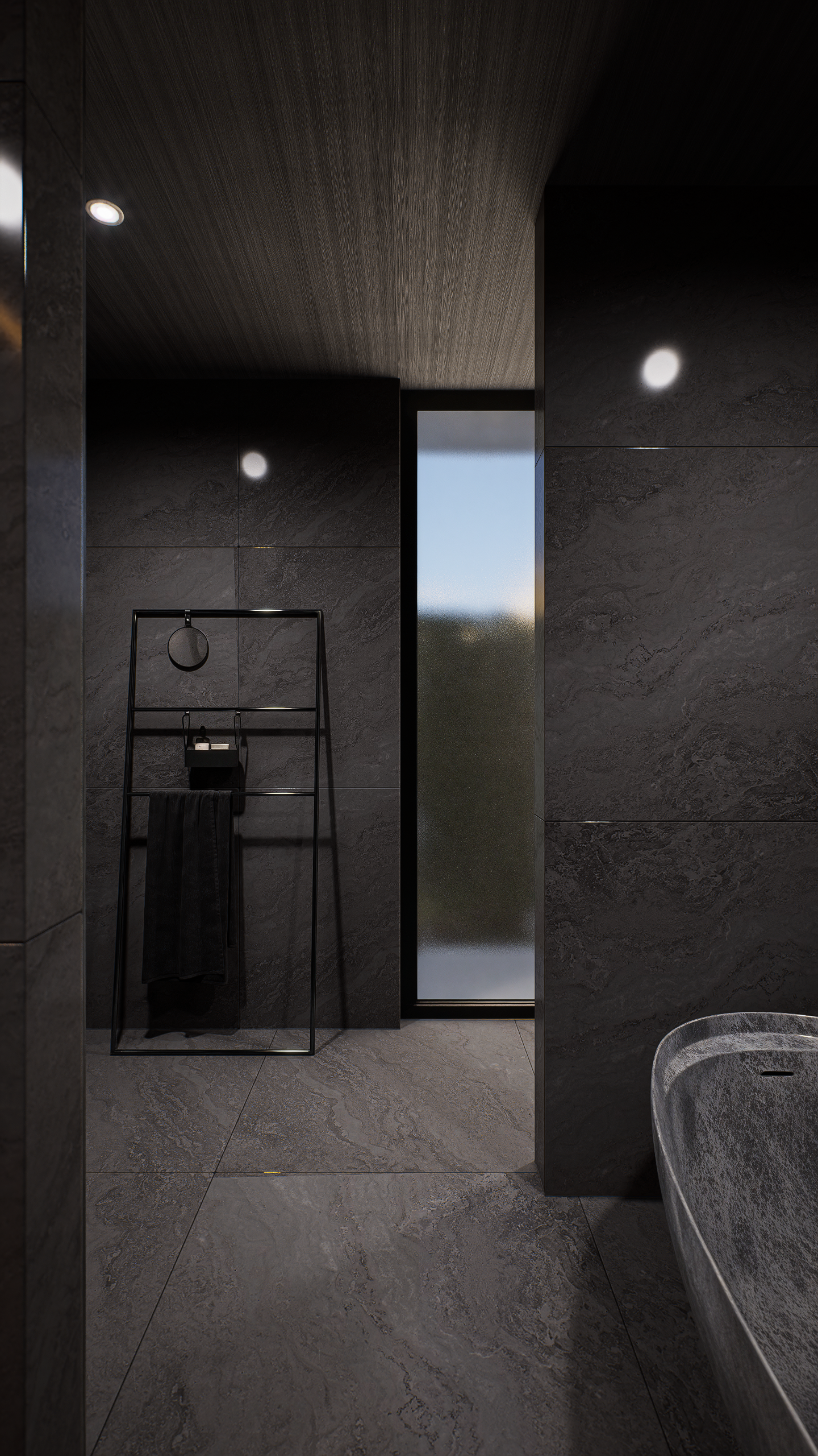 Moodne vannituba, kus tumedad looduskivitoonid ja pehme meeleoluvalgustus loovad rahuliku spa-atmosfääri. Minimalistlik sisekujundus toetub kvaliteetsetele materjalidele, selgetele joontele ja läbimõeldud funktsionaalsusele. Valgustuse kihilisus toob esile ruumi struktuuri ning muudab vannitoa hubaseks ka õhtutundidel.