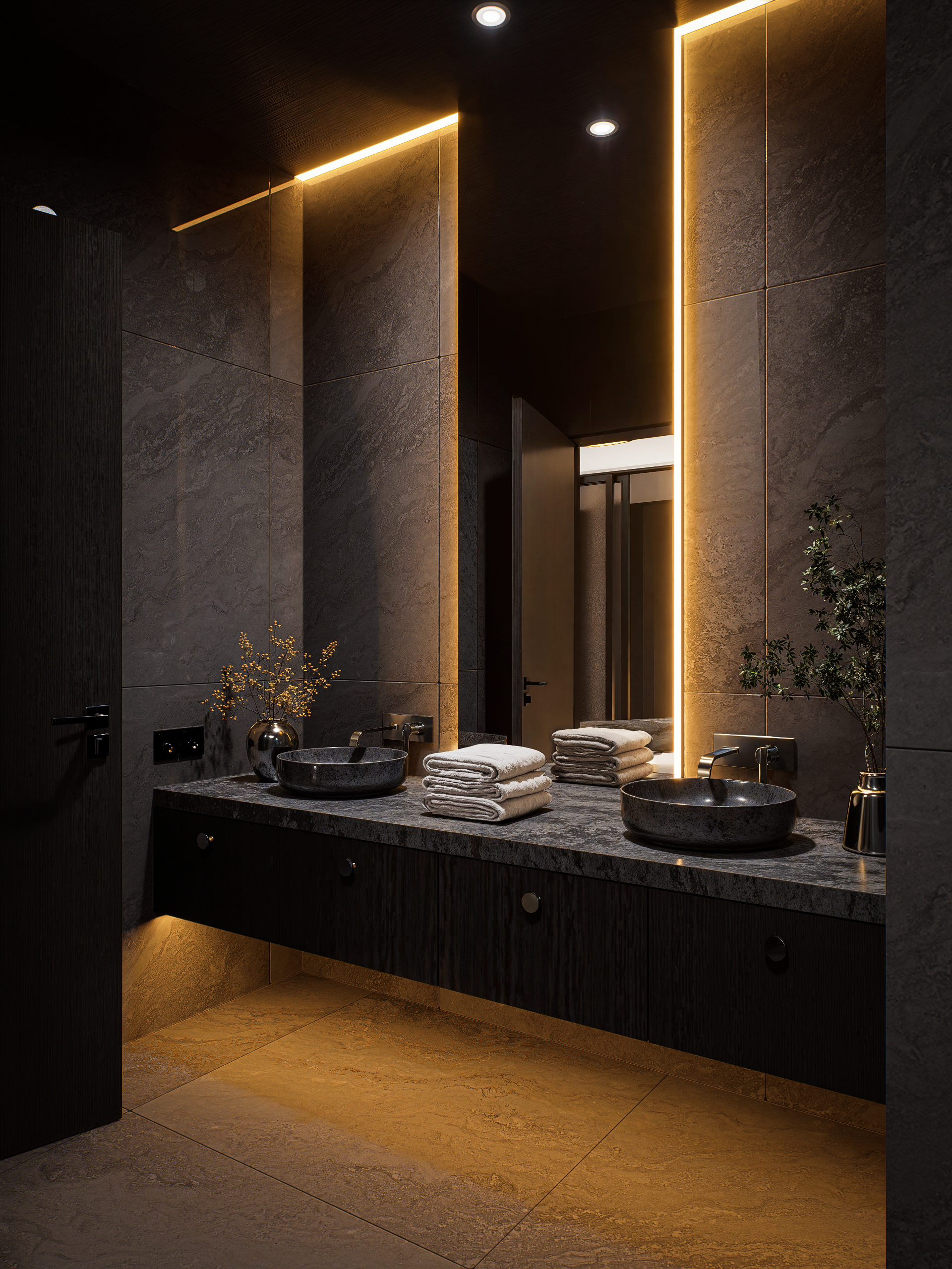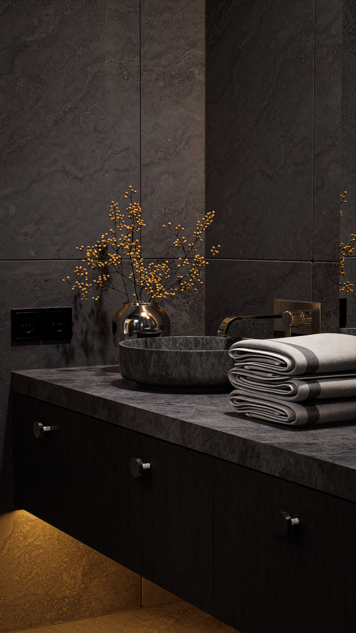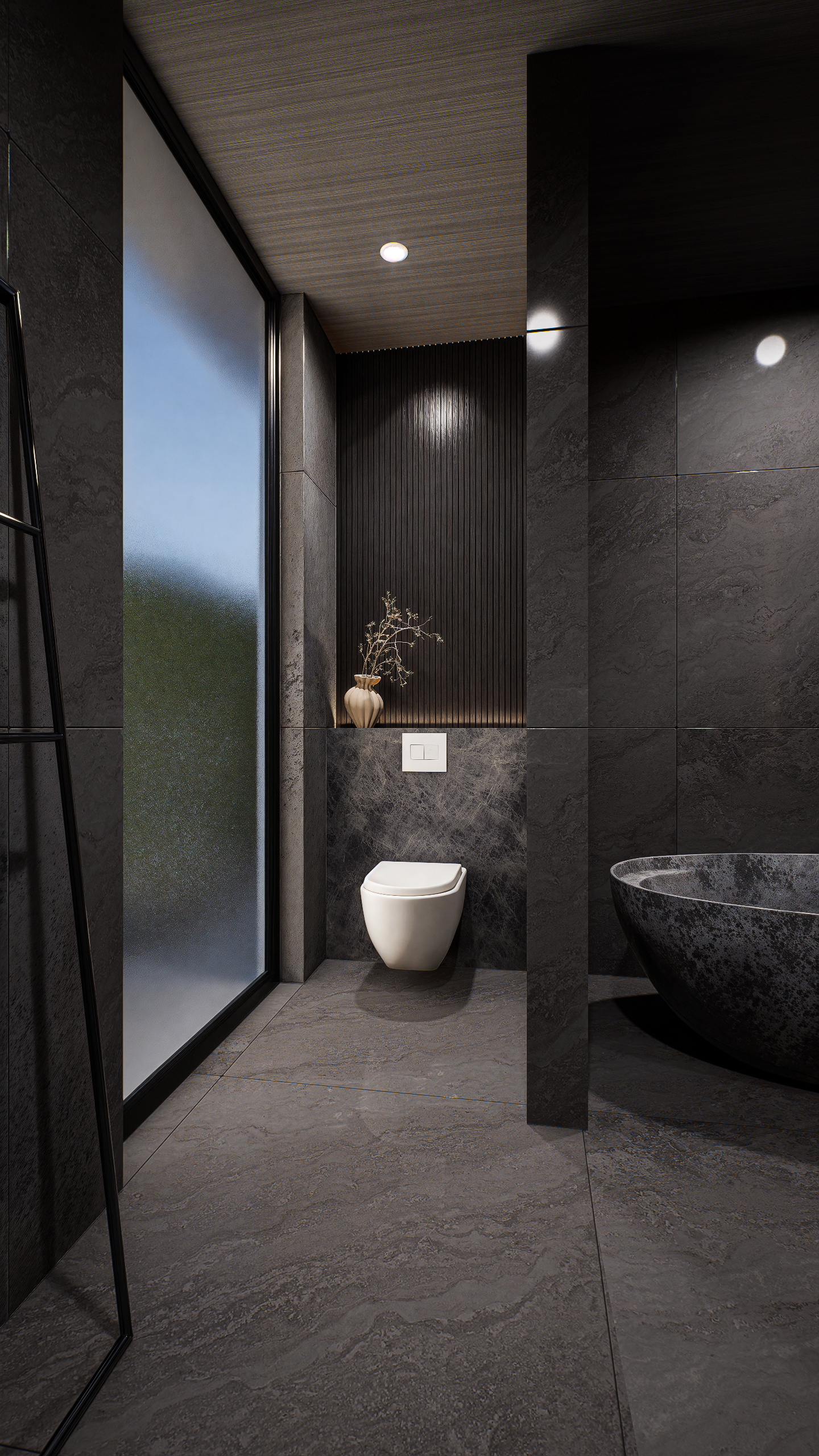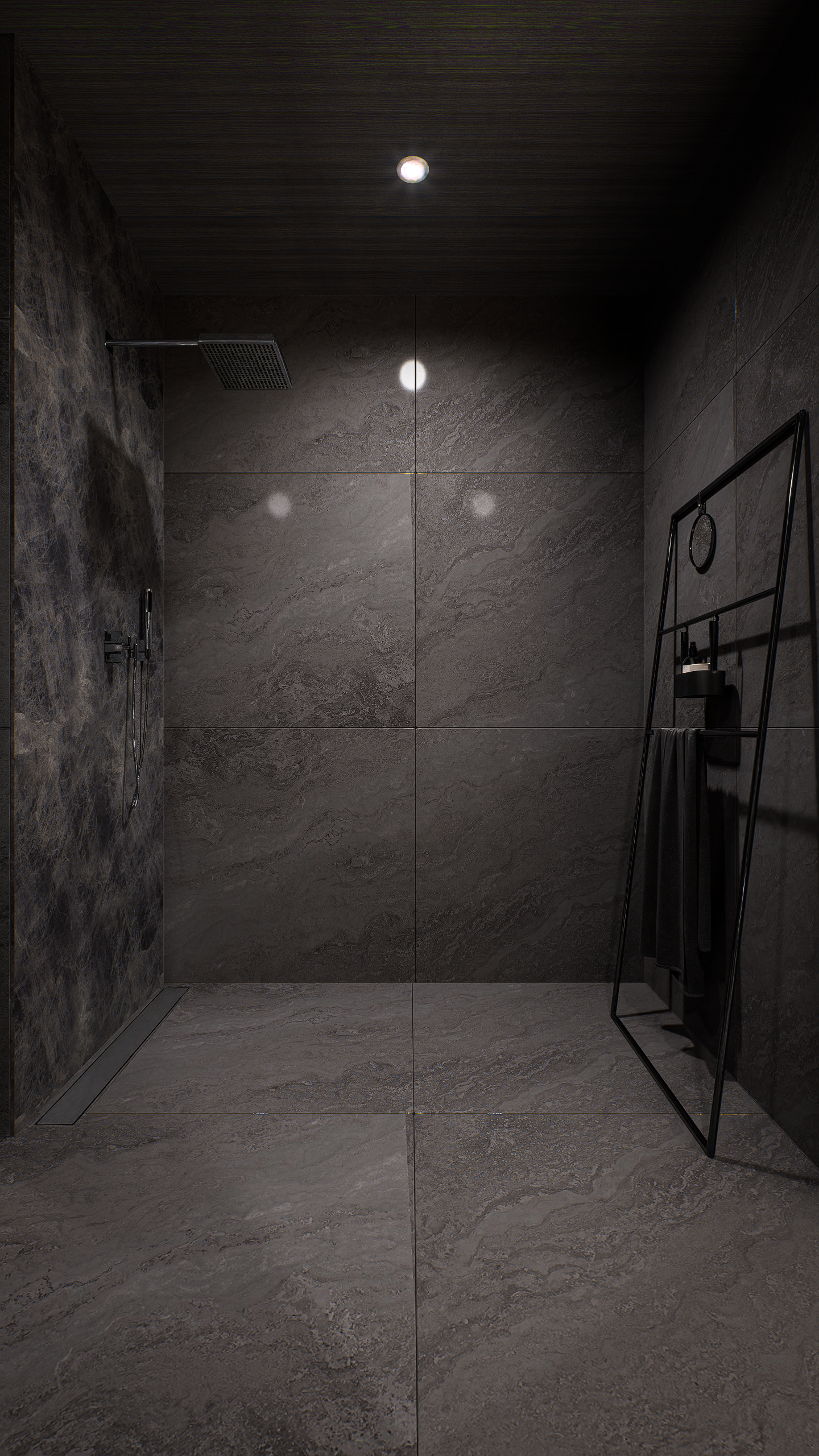 Moodne vannituba, kus tumedad looduskivitoonid ja pehme meeleoluvalgustus loovad rahuliku spa-atmosfääri. Minimalistlik sisekujundus toetub kvaliteetsetele materjalidele, selgetele joontele ja läbimõeldud funktsionaalsusele. Valgustuse kihilisus toob esile ruumi struktuuri ning muudab vannitoa hubaseks ka õhtutundidel.