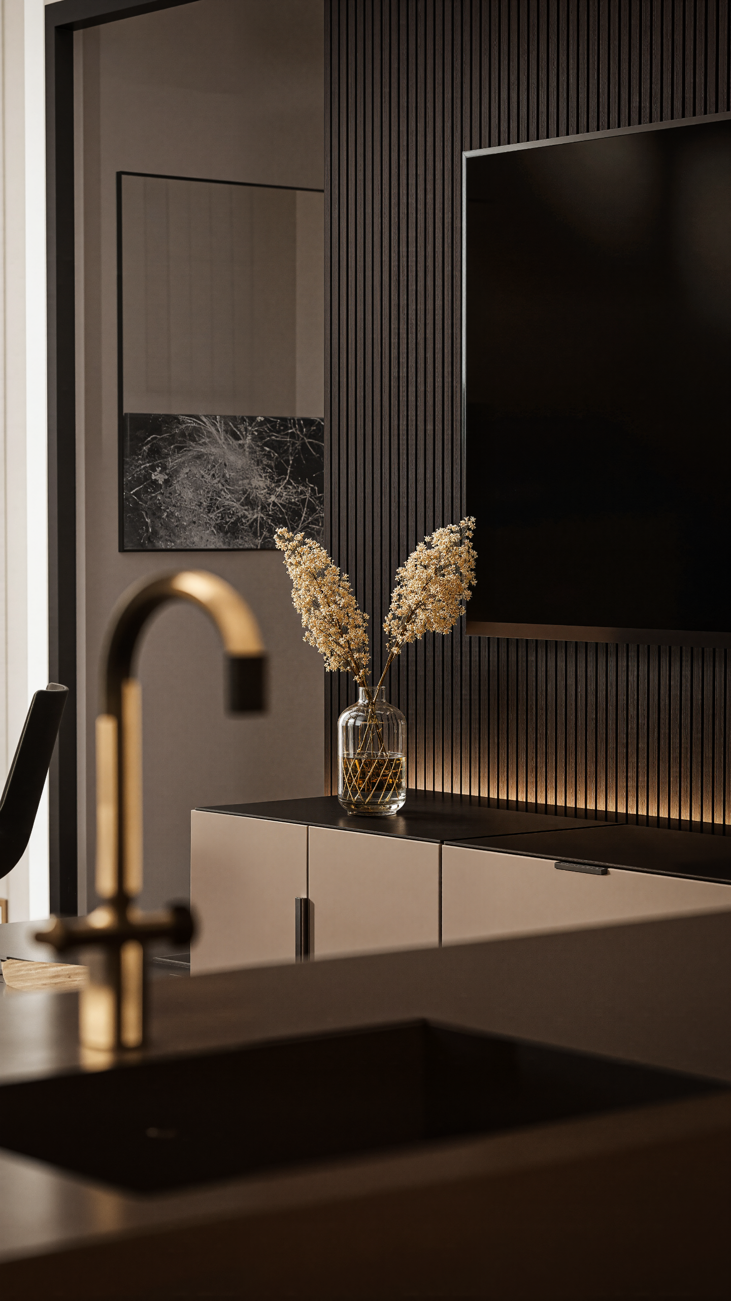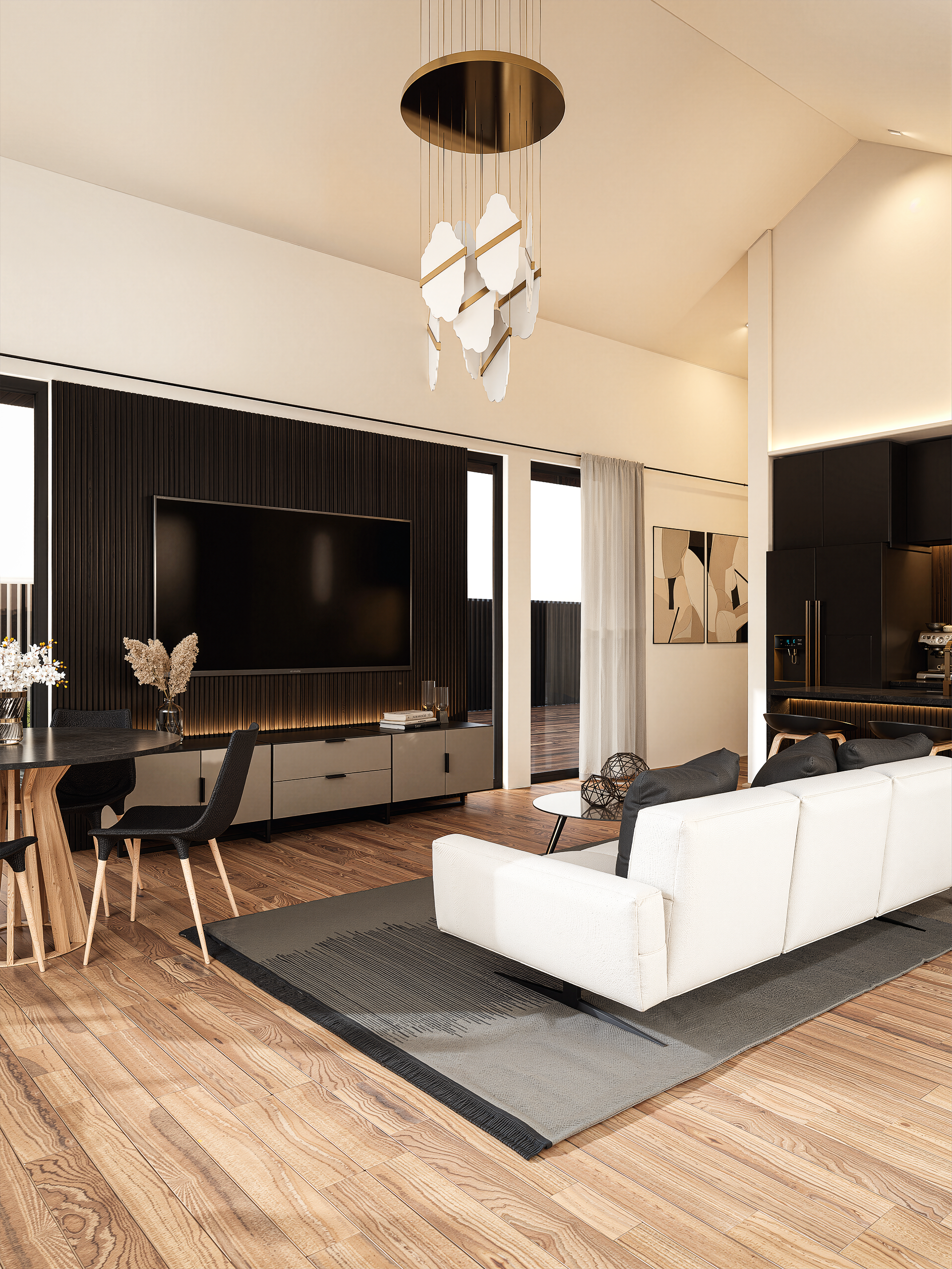 Kaasaegne ja elegantne avatud eluruum, kus tumedad aktsendid kohtuvad soojade looduslike materjalidega. Rikkalik puitpõrand, sügava tooniga köögikapid ja pehmed tekstiilid loovad esindusliku, kuid samas hubase atmosfääri. Põrandast laeni aknad toovad ruumi rohkelt loomulikku valgust ning loovad sujuva ühenduse sise- ja välisruumi vahel. Läbimõeldud valgustus rõhutab arhitektuurseid detaile ning lisab ruumile sügavust ja soojust.