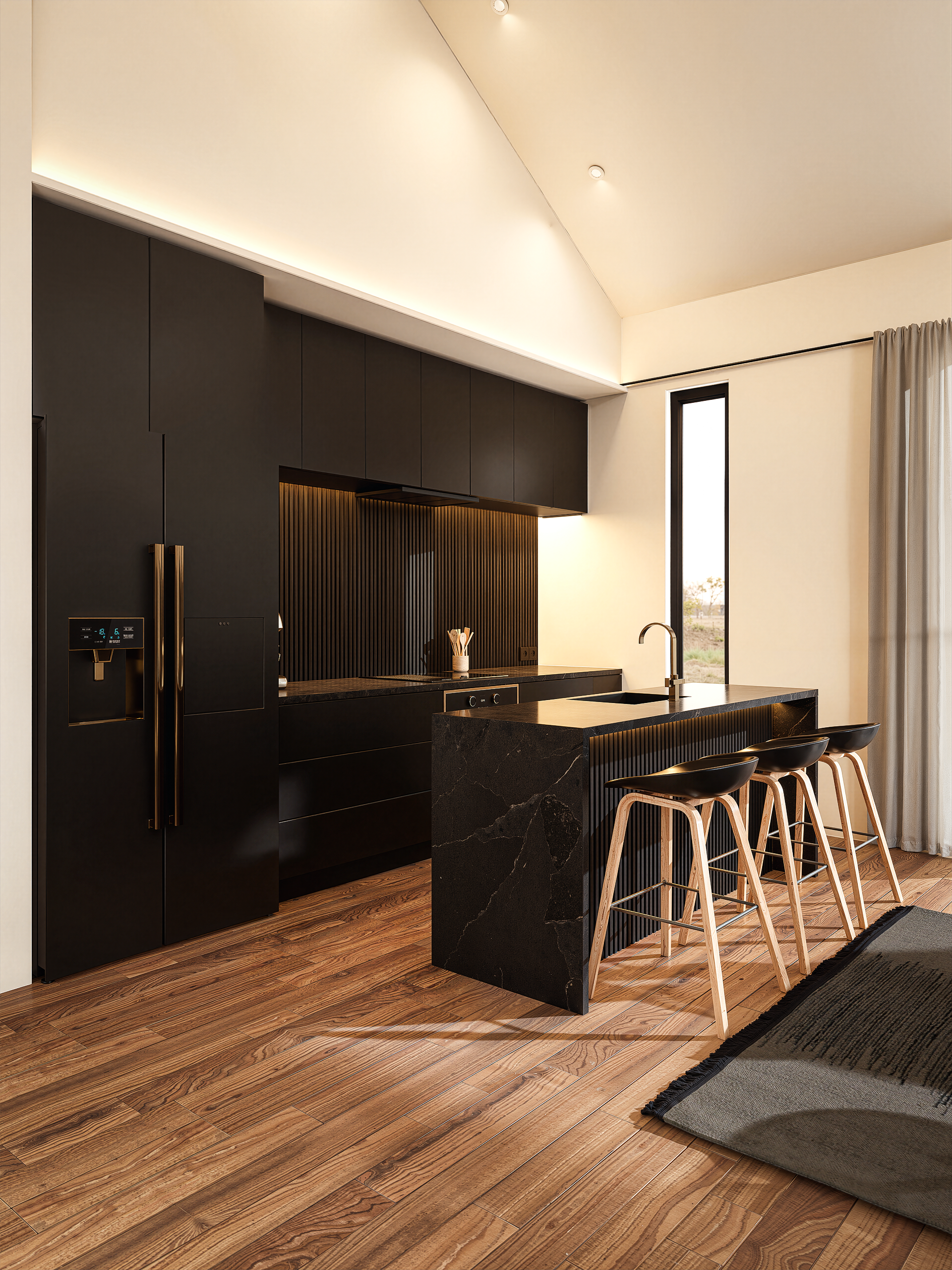 Sisekujundus valmis tihedas koostöös kliendiga ning kogu lahendus töötati detailselt läbi 3D-visualiseerimise abil. See võimaldas varakult hinnata ruumi proportsioone, materjalide kontraste ja erinevaid valgustuslahendusi. Tulemuseks on terviklik ja funktsionaalne elukeskkond, mis on visuaalselt mõjuv, praktiline igapäevaseks kasutamiseks ning ajatu oma olemuselt.