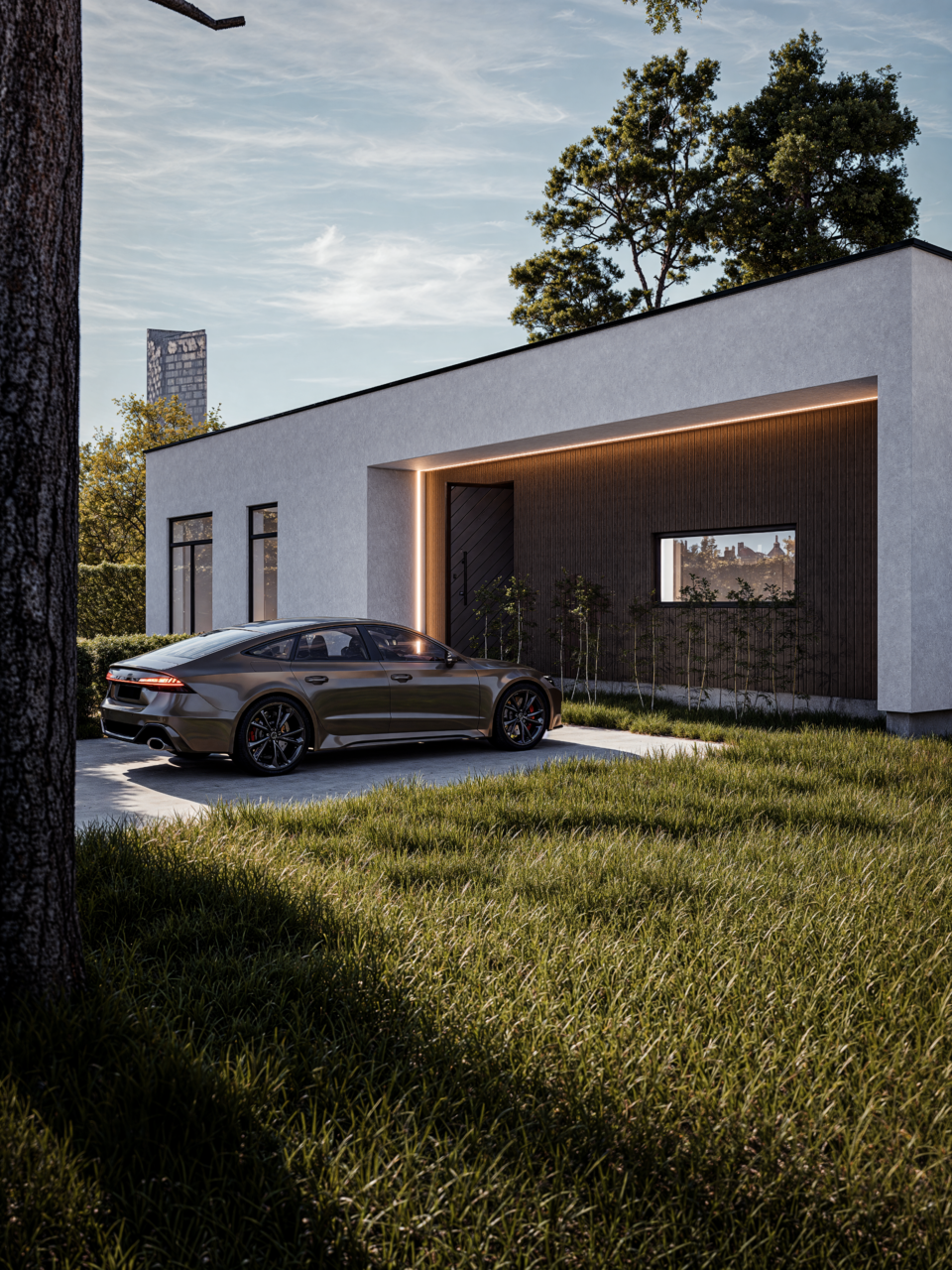 This 3D visualization brings to life the architecture of a modern and functional private house, combining minimalist style, high-quality materials, and thoughtfully designed terraces. The exterior features warm wooden surfaces and light facades, complemented by elegant black frames and details.